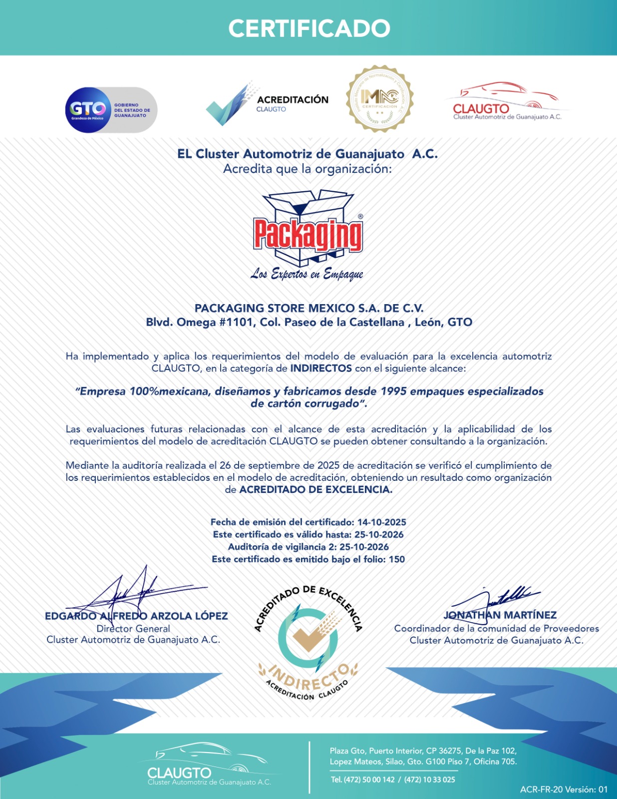 ACREDITACIÓN CLAUGTO Acreditados de Excelencia como proveedor indirecto por el Cluster Automotriz de Guanajuato.